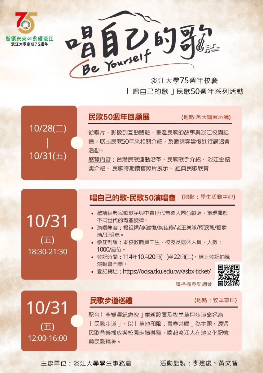 一、值此淡江大學建校75週年之際,亦適逢台灣民歌運動邁入第50年,本處特別舉辦「唱自己的歌-民歌50年系列活動」,以音樂回顧時代記憶,並展現「BE Yourself」的精神在淡江文化的傳承與延續。