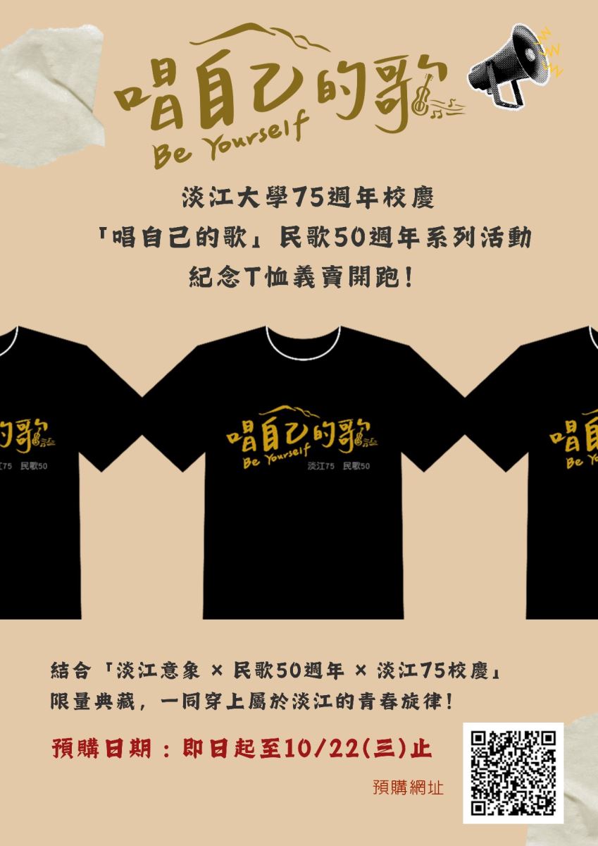 三、本次亦推出【唱自己的歌-民歌50紀念T恤】義賣活動,結合「淡江意象 × 民歌50週年 × 淡江75校慶」,限量典藏,一同穿上屬於淡江的青春回憶!。
